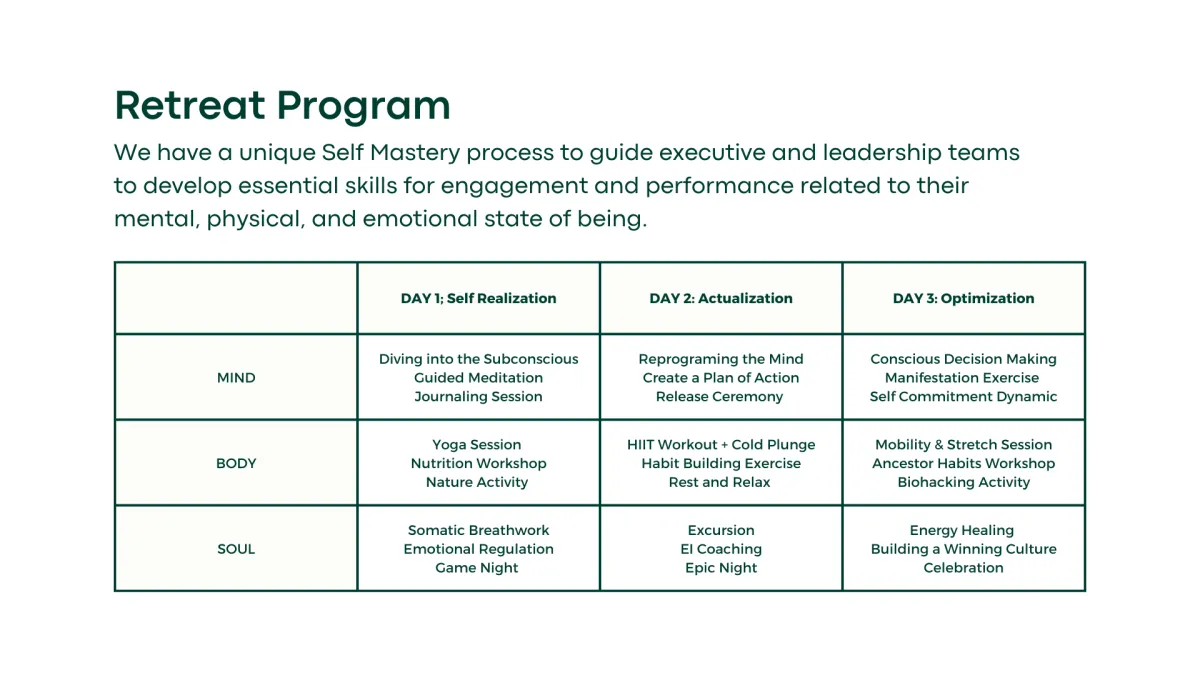 Executives and business owners looking for a deeper sense of awareness, profound clarity, boundless energy, and unwavering resilience, allowing you to breakthrough mental, physical, and emotional barriers and see game-changing results.